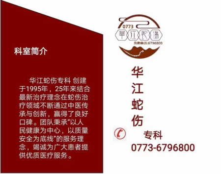 毒蛇咬伤 华江蛇伤有妙招!!!来源:华江蛇伤 毒蛇咬伤 华江蛇伤有妙招!!! 兴安县华江瑶族乡卫生院于1995年挂牌成立兴安县蛇伤治疗中心,创建蛇伤专科,2021年7月广西蛇类资源研究(华江)基地落户我院。30年来结合最新治疗理念在蛇伤治疗领域不断通过中医传承与创新,赢得了良好口碑。团队秉承“以人民健康为中心、以质量安全为底线”的服务理念,竭诚为广大患者提供优质医疗服务。